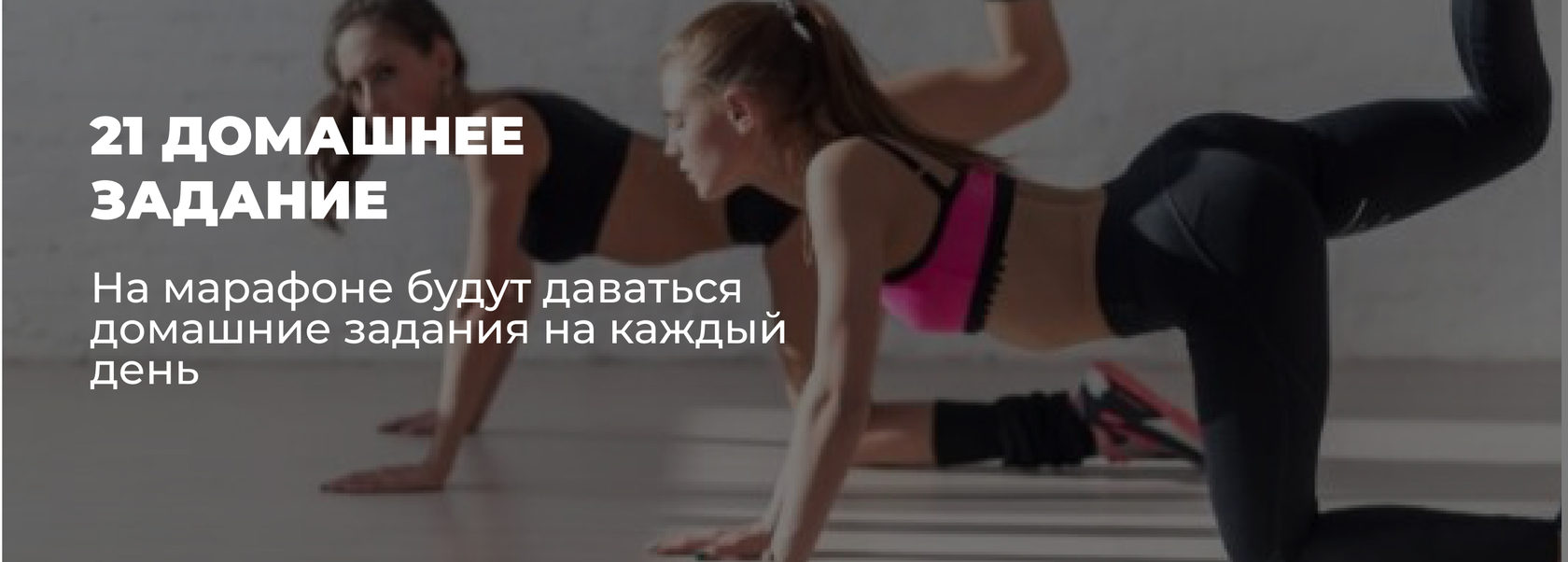 15 онлайн-тренировок, 21 домашнее задание, 2 прямых эфира, программа питания, чат участников и много другой ценной информации